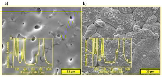 The SEM images and Raman spectra of a BiVO4 target after pulsed laser deposition. (a) The area exposed to the laser pulses and (b) the area not subjected to the ablation.