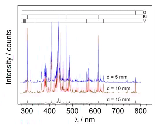 The plasma plume formed during deposition was also characterized using LIBS (laser-induced breakdown spectroscopy). The investigated radiation spectra contained clear atomic lines corresponding to oxygen, bismuth, and vanadium as well as continuous molecular spectra, which identification would require higher spectral resolution. Most probably these lines may correspond to oxygen and ozone molecules as well as bismuth and vanadium oxides or dimmers. The LIBS spectra recorded at different distances from the target during BiVO4 deposition (p = 2 mbar) are presented in Figure 7. The analyzed lines are marked in the upper part of the picture.