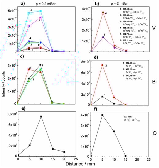 The intensities of the selected lines were plotted versus the distance from the BiVO4 target and the resulting graphs are presented in Figure 8. Measurements were performed under 0.2 and 2 mbar oxygen pressure. The dependence of intensities on a distance for low oxygen pressure was very similar for all observed vanadium lines, i.e., the intensities grew for a distance L < 10 mm and suddenly dropped later (Figure 8a). Similar dependences were observed in the case of bismuth (Figure 8c). As oxygen pressure grows the dependence changes. The maximum of intensities was shifted to lower L values, they grew for L < 5 mm and fell rapidly later, see Figure 8b,d. The dependences differed significantly in the case of oxygen both in the case of lower and higher oxygen pressure, see Figure 8e,f. Oxygen lines may originate from the oxygen ablated from the target. However, it is very likely that signals at about 777 nm originate from oxygen (ambient gas) species excited during interaction with plasma components.