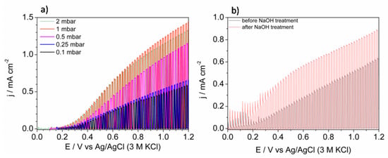 (a) The comparison of LSV curves recorded in 0.2 M K2SO4 under intermittent AM 1.5 illumination for FTO/BiVO4 photoanodes deposited under various oxygen pressures. (b) The comparison of LSV curves recorded for FTO/BiVO4 photoanodes (0.1 mbar) before and after NaOH treatment. Scan rate was 20 mV s−1.