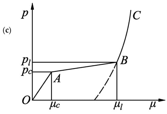 The relationship between the hydrostatic pressure and the volumetric strain of the concrete is expressed by the segmental state equation shown in Figure 4c. Stage OA describes the linear elastic stage during which , and both the loading section and unloading section can be expressed by: