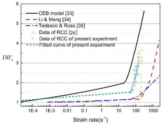 Many factors affect the compressive strengths directly obtained from the RCC experimental tests, and attention has been paid by researchers [23,30,31], especially on the dynamic strength increment, which is a combination of the strain rate effect and the lateral inertial confinement. Figure 6 shows the relationship between the (compressive dynamic increase factor) and the average strain rate of normal concrete from SHPB experimental results in various publications [32,33,34], and the data points in Figure 6 represent the experimental result of RCC whose time change law is similar to the CEB (Comite Euro-International du Beton) model. The findings are also consistent with those of other researchers [1,35]. The material strength enhancement using the DIFTOT, directly obtained from laboratory tests, will overestimate the true dynamic material strength. Therefore, the lateral inertia confinement effects need to be removed to derive the true dynamic material strength at high strain rates. In our previous study [1], numerical simulations were carried out to quantify the lateral inertia confinement effect on the concrete strength increment with respect to strain rate. The same approach is adopted here. After the lateral inertia confinement, the contribution to the strength increment is removed. The empirical formulas for the of RCC material in terms of compressive strength are derived below and will be adopted in the modified HJC model.