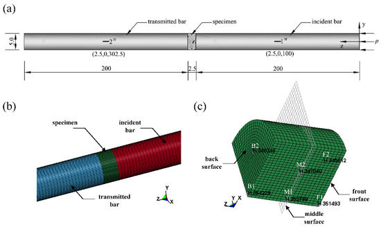 Numerical model of SHPB systems. (a) SHPB system and gage points at the bars (unit: cm). (b) Local model. (c) Specimen and gage points.