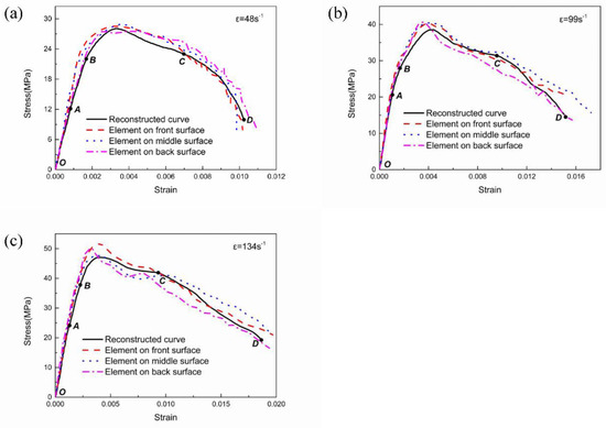 The stress–strain relationship of the stress/strain monitoring elements in specimens and three-wave method results calculated by the simulation are compared in Figure 8. Using a custom-shaped punch can achieve a loading with a single frequency half-sine wave to the pressure bar and according to the strain wave measured during the SHPB experiment, a half-sine wave with peak values of 75, 125, 175 and 225 MPa is applied severally on the front surface of the incident pressure bar and is the boundary input in the simulation. Figure 8a–c shows the stress–strain curves under different strain rates, which correspond to the SHPB experiment. Taking the stress history and strain history of the three elements at the front surface, middle surface and back surface of the specimen (elements should avoid nearing the specimen edge) eliminates the time to acquire the stress–strain curves as the dashed lines show. The full line represents the stress–strain relationship obtained by the three-wave method. The results with three strain rates of, 48, 99, and 134 s−1, which correspond to the loading stress amplitudes of 75, 125 and 175 MPa, are shown. Before the maximum stress is achieved, the curve of the typical elements and the reconstructed curve agree well. After the damage begins to develop, there is a certain degree of discretisation. For the typical elements, the descent stage of the curve is not smooth because of the evolution of the crushing damage, and the higher the loading strain rate is, the more discrete the stress–strain curves are.