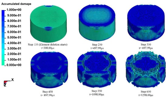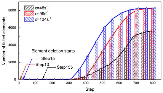 Figure 13 shows the accumulated amount of failed elements of the specimen, which is scattered to 8640 elements under three loading strain rates. It is shown that at the strain rates of 48, 99 and 134 s−1, element deletion starts at step 15, step 10 and step 155, respectively, and more elements fail at higher strain rates. The loading stress wave arrives at the specimen at approximately 350 (step 150), but the element failure is delayed, which is obvious at 800 (step 200). After 400 , the number of failed elements grows sharply, especially at the strain rate of 99 and 134 s1, until most of the elements fail, and the specimen loses its load supporting capability.
