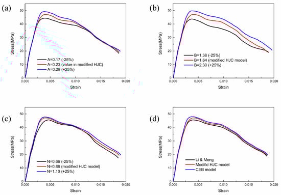 The influences of the normalized parameters on the compressive properties are shown in Figure 14a,b comparing the reconstructed stress–strain curves. The peak value of stress increases with the increasing increment of while the peak strain remains unchanged; the rising step of the stress–strain curve becomes steeper, and the descending stage becomes slower. is the normalized cohesive strength in the yield equation, and a smaller corresponds to a reduction in the cohesive strength in terms of a decrease in the peak stress. When considering the damage, is the coefficient of the damage term that controls the proportion of the damage in the yield surface, and a smaller indicates a less apparent influence on the yield surface, so the descending stage of the stress–strain curve is slower. Figure 14b shows that the variation in has no effect on the elastic stage of the stress–strain curve; however, the peak stress increases with the increasing increment of , and the gradient of the yield increase stage becomes larger. The peak value of strain and the slope of the descending segment are insensitive to the value of . controls the proportion of the pressure in the yield equation, and its variety only affects the peak stress, but the overall shape of the curve is invariant. Although and share similar controlling effects on the peak value of the stress, their physical meanings are distinct.