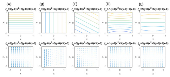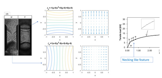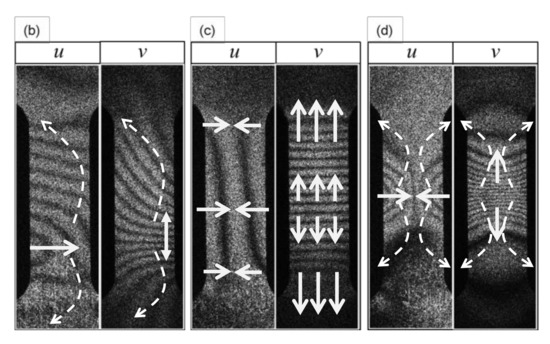 Figure 4 illustrates several basic patterns generally observed in the vertical fringes formed in the same type of tensile experiments as the present one. The upper illustration represents contours of simulating the dark fringes. The lower illustration is a quiver plot showing the spatial variation of . The second-order polynomial expressions above each vertical pair of the illustration indicate Equation (38) with hypothetical coefficients for the polynomial terms. Each pattern can be briefly characterized as follows.