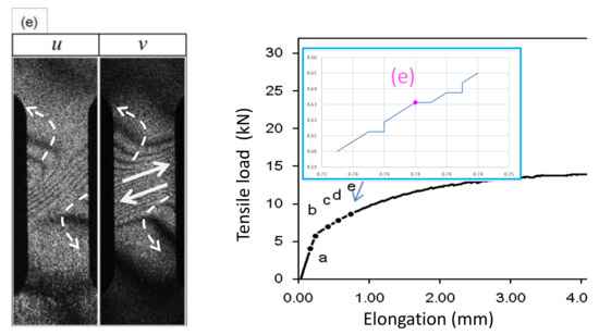 Figure 7. Developed shear stress at Post-Yield 3 stage represented by fringe pattern (e) in Figure 3 and subsequent loading behavior.This establishment of partial fracture condition in conjunction with the temporal behavior of the stress can be explained from the viewpoint of dislocation theory. The shear stress induced by the rotation pair pushes dislocations toward a side of the specimen along the boundary of the rotations. The material exerts resistive force to the dislocations by various mechanisms, such as dislocation pinning by impurities [34]. This force causes the stress rise as observed in the loading curve. Overcoming the resistive force, the dislocations keep propagating. Once the propagation reaches a side of the specimen, the exertion of resistive force ceases. Consequently, the stress drops. At the same time, the upper and lower part recoil induces rotations respectively. Since the angular momentum must be conserved (because there is no external torque), the rotations are opposite in direction. The same process repeats at the boundary of another pair of rotations where high shear stress is generated.This type of repetitive stress rise and drop is known as the serration. A number of previous studies [27,28,29,30] revealed clear correlations between serration and rotation-like fringe patterns. When a uniform stretch is hindered at a point where the dislocation is pinned, the stretch over the unpinned portions causes rotation because the deformation is hinged at the point of pinning. Previous studies [10,27] indicate that the slant, linear fringe patterns observed in association with the rotational behavior of deformation move at a velocity similar to the rotational wave. This makes sense because, as mentioned above, the formation of shear stress is caused by the rotational mode displacement. It is likely that the high shear stress is developed at the location where the rotational wave has a peak. It is interesting to note that pure aluminum specimens normally do not show a clear serration behavior and the post-yield parabolic fringe patterns are usually not slant. This can be explained as follows. When the material is free of impurity, the dislocations are not pinned and, therefore, the material undergoes deformation without the type of rotations that exhibit slant, non-linear fringes. The formation of the shear stress along with the associated stress drop and the explanation based on dislocation theory is a subject of our future study. - Point (f); Post-Yield 4 stageThis point is characterized as the maximum stress point on the loading curve Figure 3A. The similarity in the overall fringe pattern to Point (e) indicates that the developed shear deformation along the boundary of the counterclockwise rotation pair is still active. The fact that the stress starts to decrease from this point on indicates reduction in the elastic modulus. The propagation of dislocations associated with the serration is responsible for the reduction in the elastic modulus. The enhancement in the similarity between the u- and v-fringe patterns indicates that this is the onset of the transition to the final fracture (see the discussion for Point (g) in the next paragraph).
