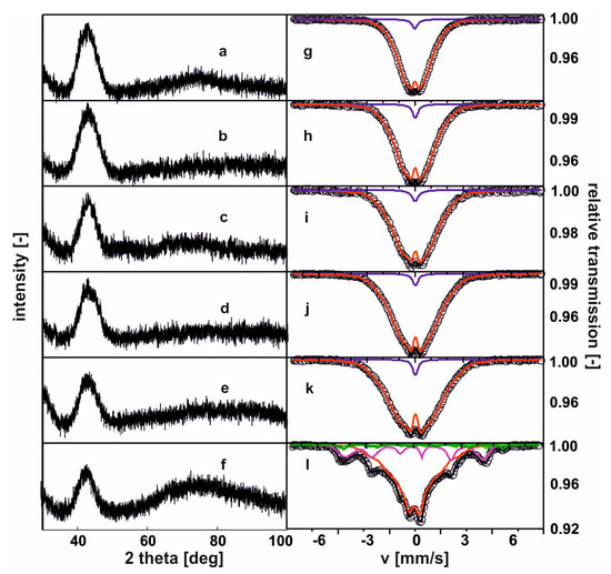 X-ray diffraction images patterns and Mössbauer spectra for the alloys: (a), (g) Fe65Nb5Y5Hf5B20; (b), (h) Fe65Nb5Y6Hf4B20; (c), (i) Fe65Nb5Y7Hf3B20; (d), (j) Fe65Nb5Y8Hf2B20; (e), (k) Fe65Nb5Y9Hf1B20; (f), (l) Fe65Nb5Y10B20. [26].