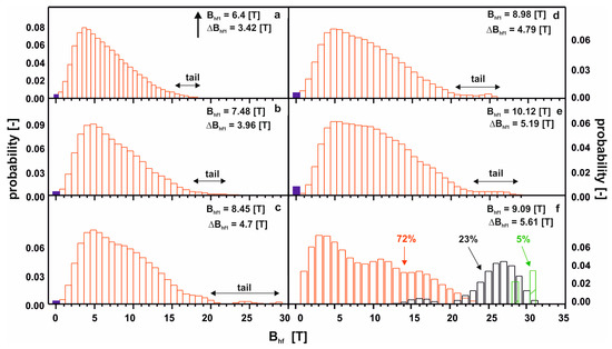 On the recorded X-ray diffraction patterns, there were only wide maxima within the range of 40—50° of the two-theta angle. The transmission Mössbauer spectra, presented in Figure 2, were typical for ferromagnetic, amorphous alloys with a relatively low hyperfine field. In effect, low Curie temperatures are expected [26]. In the case of the first five spectra, a residual paramagnetic phase was also observed (blue line). For the last of the studied alloys, the Mössbauer spectrum consisted of three components: two resulting from amorphous matrices, and one from the minor volume of a phase with order similar to the Fe5Y crystalline phase. Figure 3 shows the distribution of the hyperfine field induction on the 57Fe nuclei, corresponding to the spectrum from Figure 2.