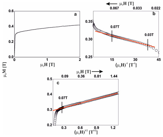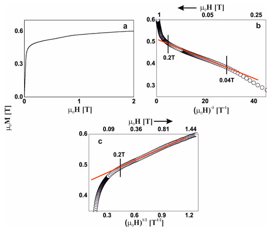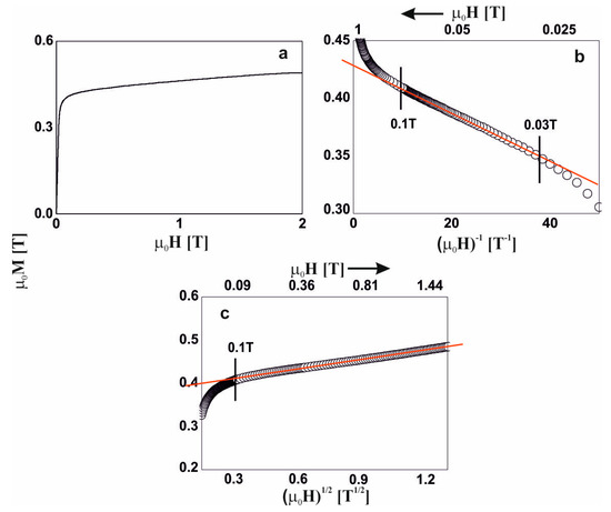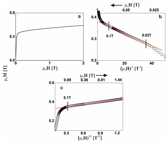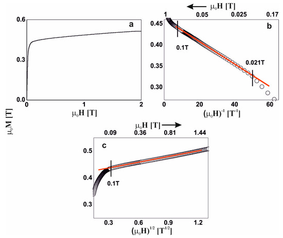 Magnetization curves for the Fe65Nb5Y8Hf2B20 alloy: (a) initial magnetization curve, magnetization as a function of: (b) (µ0H)−1 and (c) (µ0H)1/2.