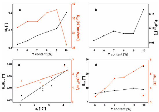 The first relationship found is the monotonic increase in saturation magnetization with increasing Y content in the alloy (an increase of approximately 0.02T per 1 atomic% Y). The exception in this case is the alloy with no addition of Hf, for which the saturation magnetization increases by 0.09 T. A similar relationship was found for the value of the transition field to the Holstein–Primakoff paraprocess. Based on these relationships, it should be stated that the examined process of magnetizing the examined alloys is identical for all the tested Y contents—from 5% to 9% atomic. For these alloys, the value of the Dspf parameter increases linearly. In the case of the alloy without the addition of Hf, significant structural reconstruction occurs. This alloy is harder to magnetize, as evidenced by the higher value of the transition field to the Holstein–Primakoff paraprocess and the much higher value of the coercive field, compared to other alloys. It is also interesting that this alloy has the highest MS and the lowest value of the Dspf parameter. The value of this parameter can be associated with the environment of the Fe atoms: the number of magnetic neighbors and the distances between them. In fact, this part of the work is not provided with literature equivalents and one can get the impression that the information presented is based on assumptions. According to Kaul [29] and Corb [30] in the work of Kronmüller, in a relaxed amorphous structure, each magnetic atom has 12 neighbors, and in non-relaxed, 9–10 neighbors. An increase in the Dsp parameter value may be associated with an increased number of the nearest magnetic atoms, which is associated with the improvement of short-range chemical order (SRO). A lower value of the Dspf parameter in this case may mean an increase in the distance between individual Fe atoms. The arrangement of atoms in this alloy can reduce the presence of antiferromagnetic ordering, resulting in a higher saturation magnetization. However, the configuration of magnetic atoms in the Fe65Nb5Y10B20 alloy has a negative effect on creating soft magnetic properties, causing a significant increase in the coercive field value. The dependence of the coefficient a1 on the value of the transition field to the Holstein–Primakoff paraprocess was also identified: as the coefficient a1 increases, the necessary value of the external magnetic field—in which magnetization depends on the damping of thermally-induced spin-waves—also increases. A similar relationship was found for the density of linear defects: Ndip increases with increasing value of the coefficient a1.