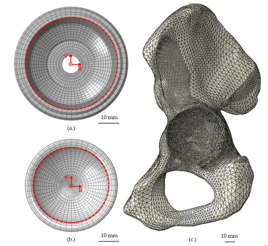 - Ghosh, R.; Gupta, S. Bone remodelling around cementless composite acetabular components: The effects of implant geometry and implant-bone interfacial conditions. J. Mech. Behav. Biomed. Mater. 2014, 32, 257–269. [Google Scholar] [CrossRef] [PubMed]