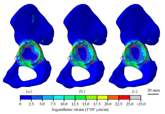 Strain distribution in the adjacent bone of the hemi-pelvis after relaxation of the acetabular shell, dependent on the chosen shell material (a) titanium, (b) CFR-PEEK-23 and (c) CFR-PEEK-15. Differences visible on the macroscopic scale are highlighted in red.