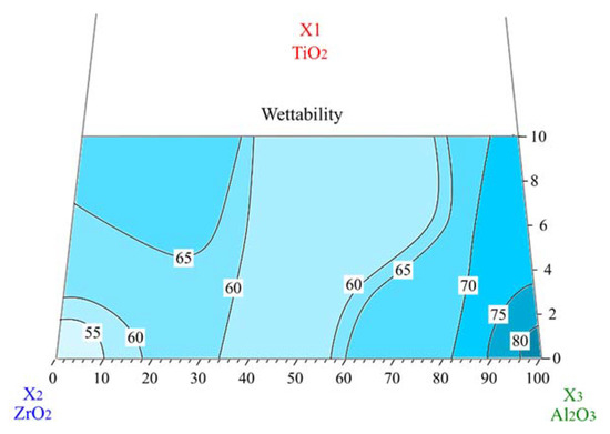 Contact angles of different ceramics with water on a ternary TiO2-Al2O3-ZrO2 plot.
