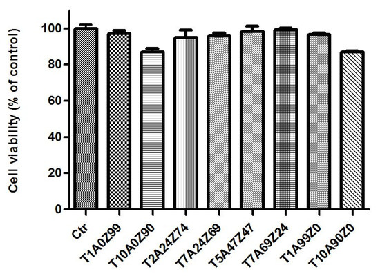 These results lead to the conclusion that the composites containing 10 wt.% TiO2 induced DNA damage. There was, indeed, a significant difference in the tail length, the tail DNA%, and the tail moment between the negative control and the two composites T10A0Z90 and T10A0Z90. On the other hand, the composites that had a lower percentage of TiO2 (0.27; 2.5; 5; 7.5 wt.%) did not induce any significant DNA damage.