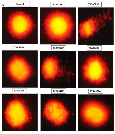 Typical SCGE images for the control and each composite were shown in Figure 5A. SCGE images were captured and analyzed by the CASP package, and the tail length, tail DNA%, and tail moment of all the 100 selected cells of each experiment group was calculated (Figure 5B). According to tail length results, T10A0Z90 (133.09 ± 8.66) and T10A90Z0 (148.51 ± 10.08) showed significant differences with negative control (36.86 ± 3.56) and with other composites (T1A0Z99, T1A99Z0, T5A47Z47, T2A24Z74, T7A24Z69, and T7A69Z24) (p < 0.001). Similar results were obtained in the tail DNA% and tail moment analysis. None of the T1A0Z99 (3.08 ± 0.47), T1A99Z0 (2.91 ± 0.46), T5A47Z47 (3.92 ± 0.40), T2A24Z74 (3.48 ± 0.29), T7A24Z69 (4.05 ± 0.46), and T7A69Z24 (4.09 ± 0.53) cell groups showed statistically significant differences with the negative control (2.90 ± 0.36) (p > 0.001), in fact, while T10A0Z90 (11.24 ± 1.08) and T10A90Z0 (11.89 ± 1.05) were significantly different with these composites and negative controls (p < 0.001). As indicated by tail moment results, none of the T1A0Z99 (2.12 ± 0.39), T1A99Z0 (2.03 ± 0.37), T5A47Z47 (2.28 ± 0.39), T2A24Z74 (2.16 ± 0.28), T7A24Z69 (2.57 ± 0.49), and T7A69Z24 (2.56 ± 0.35) cell groups showed differences with negative control (1.67 ± 0.25) (p > 0.001), while T10A0Z90 (11.85 ± 1.07) and T10A90Z0 (13.61 ± 1.14) were significantly different with these composites and negative control (p < 0.001).