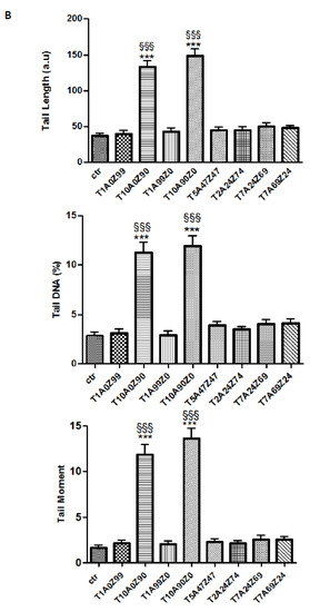 The DNA damage was assessed using the SCGE method, also known as comet assay, as previously described [22]. The fibroblast cells were briefly harvested from suspension and then embedded in a thin layer of agarose gel (1% low melting) upon clear microscope slides. Cells were lysed and DNA was unwound under alkaline conditions (1 mM EDTA and 300 mM NaOH–pH 13) for 20 min. Afterwards, electrophoresis was employed for 30 min at 300 mA and 25 V (*0.86 V/cm). Following electrophoresis, the slides were washed with 0.4 M tris(hydroxymethyl)aminomethane (Tris) (pH 7.5) and stained with ethidium bromide (2 µg/mL). Analysis was carried out by using a DM IRB fluorescence microscope (Leica Microsystem, Heidelberg, Mannheim, Germany), equipped with a digital recording Power Shot S50 camera (Canon, Milan, Italy). Two replicas for each batch were carried out. Images of 50 cells per slide (100 cells per batch) were randomly acquired and analyzed using CASP software (v.1.2.3, Casplab, Wrocław, Poland). The featured parameters were: length (TL), percentage of DNA (% T-DNA) and moment (TM) of the tail. All values were statically evaluated by one-way ANOVA (Analysis of Variance).