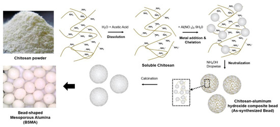 33]. At the same time, the alumina precursor was hydrolyzed and condensed in the polymer matrix of chitosan beads, resulting in a chitosan-aluminum hydroxide composite. Finally, the Bead-Shaped Mesoporous Alumina (BSMA) was obtained by calcining the as-synthesized chitosan-aluminum hydroxide composite beads (as-synthesized beads) at 600 °C. Since the chitosan template plays an important role not only in formation of the bead-shaped particles but also as a pore-forming agent, BSMA can be obtained by removing the chitosan by calcination at a high temperature.