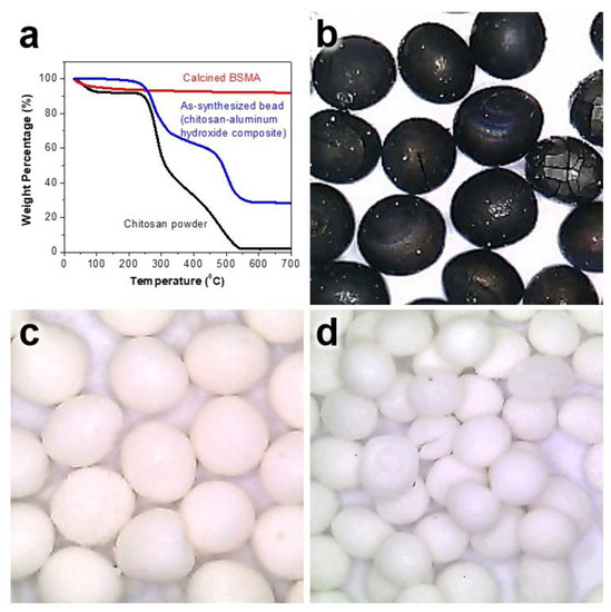 Figure 2c,d). In addition, even though the BSMA sample was treated at 800 °C, the spherical morphology was well maintained, indicating the thermal stability of the BSMA sample. Based on the above results, as-synthesized chitosan-aluminum hydroxide beads should be calcined at above 600 °C.