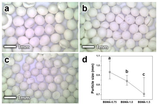 Figure 3d, the average particle diameter of BSMA continuously decreased, from 0.92 to 0.84, and 0.77 mm, with the change in the ratio of the chitosan template to the alumina precursor from 0.75:1 to 1:1, and 1.5:1, respectively. In order to estimate uniformity and average particle size, we counted more than 60 particles from digital photo images and visualized particle size as a histogram (