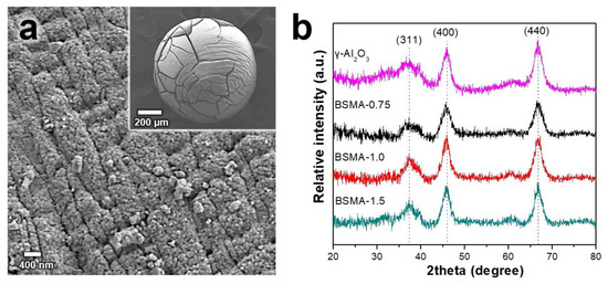 3 and all BSMA samples revealed typical diffraction pattens of the gamma alumina phase at 2θ = (37.6°, 45.8°, and 66.8°) attributed to (311), (400) and (440), respectively [