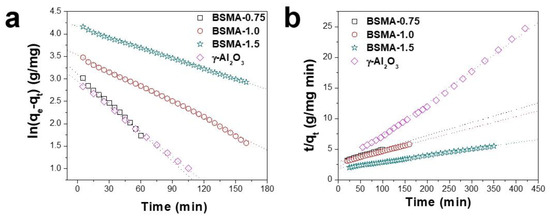 2 = 0.996~0.999) in the second-order model. Both the first-order and second-order adsorption kinetic models showed a high coefficient of determination, indicating that both adsorption kinetics models are well fit over the BSMA samples. BSMA-0.75 showed the largest kinetic constant values (k
