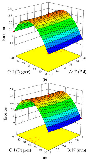 The ANOVA test was conducted to validate the suitability of developed models for creating a link between the erosion parameters and response. The analysis of variance for erosion is depicted in Table 3. From the ANOVA table, it is clear that the impingement angle was the most significant erosion parameter for the solid particle jet erosion process. The combined effect of machining parameters on erosion is shown in Figure 5a–c. Figure 5a shows the influence of slurry pressure and nozzle diameter on the erosion rate at a constant impingement angle of 60°. The interaction of parameters predicts that at a constant impingement angle of 60°, the erosion was highest with a slurry pressure of 75 Psi and a nozzle diameter of 2.5 mm. The combined effect of the nozzle diameter and impingement angle at constant slurry pressure of 75 Psi is shown in Figure 5b. The results predict that erosion increased with an increase in the impingement angle from 30 to 60° but started decreasing in the next level. During this phase, the nozzle diameter had the least effect on erosion loss. Figure 5c shows the interaction effect of slurry pressure and impingement angle on erosion at a constant nozzle diameter of 2.5 mm. The surface plot indicates that a medium level of impingement angle with maximum slurry pressure produced higher erosion over the composite surface.