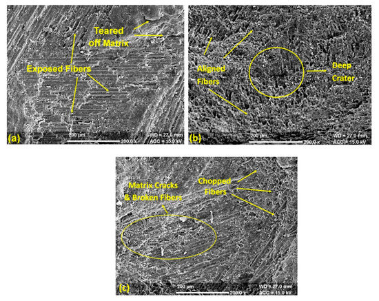 The overall analysis shows that the impingement angle of striking the slurry influenced the erosion process more significantly than slurry pressure and nozzle diameter. The available trends show that the present composite material could be classified in the semi ductile category because these materials show the highest erosion in the range of 45–60° for the impingement angle [31]. Additionally, the essential factor in controlling the erosion behavior is the nature of the erodent particle. The irregular shape and size of erodent particles induce high erosion in polymer matrix composites [32]. The form of striking erosive particles profoundly influences the nature of deformation of the surface. The round edge particles induce plastic deformation, whereas sharp and hard particles exhibit brittle deformation of the surface [33]. The state of the composite surface at a variable impingement angle is shown in Figure 9a–c. At the impingement angle of 30°, the abrasive slurry chipped off and tore down the composite surface, which made glass fibers visible as shown in Figure 9a. The slurry impact somehow degraded the upper layer, but the strong interfacial bond strength kept the fibers and matrix closely bonded. However, with the change in the impingement angle to 60°, the degradation rate of the primary layer of matrix increased and brought reinforcement into direct contact of the abrasive slurry. The exposed reinforcement aligned in one direction and resulted in high erosion loss. The upper surface damage at the impingement angle of 60° is visible in Figure 9b. The further increase in the impingement angle to 90° decreases the horizontal component [34]. This decrease in the horizontal component decreased the cutting rate of fibers and matrix as compared to erosion at 60º because the increased vertical composite produced a harrier surface, which significantly reduced the erosion rate (Figure 9c). Although few broken fibers and matrix cracks were visible over the surface, still the matrix was uniformly bonded with fiber reinforcement.