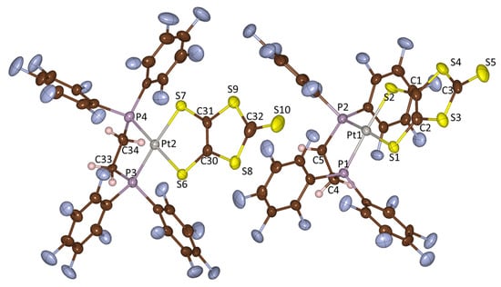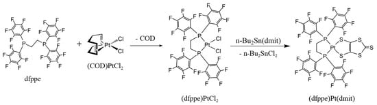 The (dppe)Pt(dmit) complex was prepared from (dppe)PtCl2 and Na2(dmit) according to a previously reported procedure [12]. The synthesis of the (dfppe)Pt(dmit) complex, having an F-enriched end-functional group, involved (dfppe)PtCl2 and n-Bu2Sn(dmit), following an analogous salt elimination process (Scheme 1). Product identification was confirmed by spectroscopic analyses. The structure of the as-synthesized (dfppe)Pt(dmit) complex was additionally confirmed by X-ray diffraction for molecular structure analysis (Table 1 and Table 2, and Figure 1). The molecular structure of (dfppe)Pt(dmit) shown in Figure 1 is virtually isostructural with that of (dppe)Pt(dmit) [22], with the former bearing F, and the latter H atoms on the diphosphine chelate ligands. Their principal bond lengths and angles were likewise analogous, as compared in Table 1.