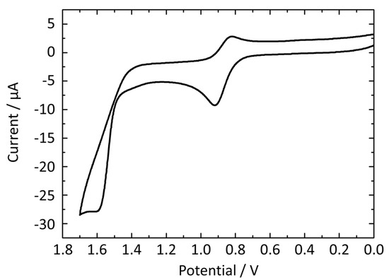 Cyclic voltammogram of (dfppe)Pt(dmit) measured in dichloromethane (DCM) (Fc/Fc+ = 0.532 V vs Ag/AgCl, 0.1 M n-Bu4N⋅ClO4, Pt-button electrode, Ag/AgCl, 100 mV/s).