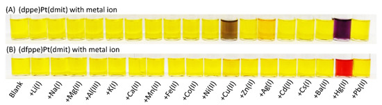 Color changes of H2O/CH3CN solution (0.2 mM, 1:1 v/v %) of (A) (dppe)Pt(dmit) and (B) (dfppe)Pt(dmit) upon the addition of one equivalent of metal ions.