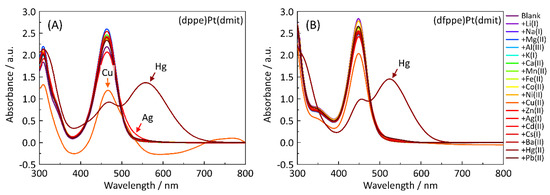 UV-vis spectra of (A) (dppe)Pt(dmit) and (B) (dfppe)Pt(dmit) complexes with or without metal ions (Li+, Na+, K+, Cs+, Mg2+, Ca2+, Ba2+, Mn2+, Fe2+, Co2+, Ni2+, Cu2+, Zn2+, Ag+, Cd2+, Hg2+, Al3+, and Pb2+) dissolved in H2O/CH3CN solution (1:1 v/v %). The absorption peaks due to the >C=S moiety observed at (A) 463 nm and (B) 448 nm show a noticeable bathochromic shift upon the addition of Hg2+ ions.