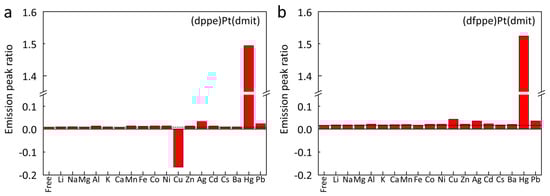 Ionic Hg (Hg2+) is well known for its high toxicity, and can be found in water, soil, and food [1]. The ions accumulate in the organism and interact with thiol groups of proteins, causing serious damage to the central nervous system and posing a significant threat to human health and the natural environment. Therefore, the detection of Hg2+ ions is a fundamental requirement for monitoring the environment and human health [2]. Various sensor platforms for Hg2+ detection have been developed to date, based on inorganic substances, oligonucleotides, liposomes, proteins, polymers, DNA glymes, small fluorescent organic molecules, and other compounds [2,3,4,5,6,7,8,9]. In supramolecular chemistry, the fluorescent chemosensor is one of the most significant designs because of the possibility of straightforward manipulation of photophysical processes that enables sensitive and selective signaling of targeted ion components [10]. Previously, we have reported a series of studies regarding (diphosphine)Pt(dmit) complexes (dmit: 1,3-dithiole-2-thione-4,5-dithiolate) as cation chemosensors that can be converted to operate via a ratiometric internal charge transfer, especially for Hg2+ detection [11,12,13]. These complexes created a large pseudo-Stokes shift between the analyte-free and analyte-bound emissive states. It rendered them wavelength-ratiometric, which means that potential artifacts were eliminated based on the internal referencing of the signal. Selectivity can be achieved only when the emission peaks for the free and bound-chemosensor shows clearly distinct intensities. However, the ratio of intensities is related to an inherent characteristic of a particular analyte and chemosensor interaction; hence, a systematic methodology for the control of signal ratio has rarely been practiced hitherto [10].