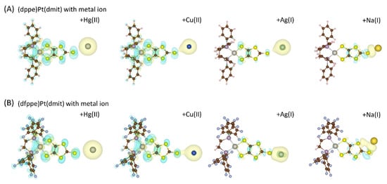 Charge analyses of (A) (dppe)Pt(dmit) and (B) (dfppe)Pt(dmit) complexes with representative metal ions. The charge accumulations and charge reductions around the molecules are shown as yellow and blue surfaces, respectively. The isosurface is 0.0015e a0−3, where a0 is the Bohr radius.