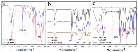 FTIR spectra of (a) H-PDMS and EP-PDMS; (b) P-G01, P-G05, and P-(G01+G05); (c) G-SP-G01, G-SP-G05, and G-SP-(G01+G05).