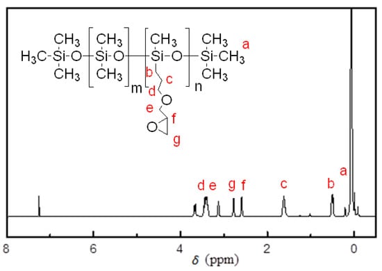 Figure 2 shows the H-NMR spectrum of EP-PDMS in CDCl3 solvent. The strong signals that appeared around δ 0 ppm belong to the silicon methyl protons [24]. The specific signal at δ 0.49 ppm (b) comes from the methylene protons formed after hydrosilylation reaction, and the signals appeared at δ 2.58 ppm (f); δ 2.77 ppm (g) belongs to the protons of the epoxy groups [24]. The appearance of these peaks confirmed the successful synthesis of EP-PDMS.