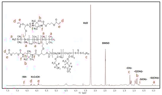Figure 3 shows the 1H-NMR spectrum of the synthesized fluorinated siloxane copolymer G-SP-(G01+G05) in DMSO-d6 solvent. The characteristic resonance signals of the double bonds bearing on the grafted side chains appear at δ 5.92 ppm (e), 6.28 ppm (d) [23,24]; the signal at δ 6.7 ppm (f) corresponds to the -NH- protons [20,24] formed via the coupling reaction between IPDI-HPA and the fluorinated intermediates. The proton signal at δ 0.75 ppm (i) belongs to the methylene [24] that linked to the PDMS backbone via hydrosilylation. The signals at around δ 0 ppm belong to the silicon methyl proton on the backbone [24]. Due to the shielding effect of the side chains, the signal strength of methyl group is greatly weakened. In addition, the signals of methyl protons that linked to the IPDI rings locate at around δ 0.90 ppm (b) [23,25]. The occurrence of these characteristic signals indicates that the desired fluorinated siloxane copolymer was successfully synthesized.