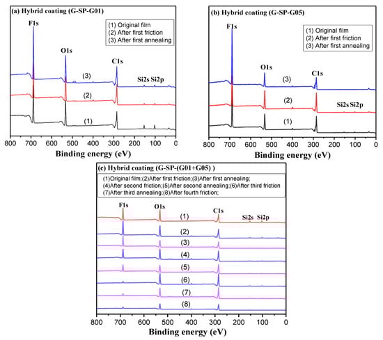 XPS traces of the three hybrid coatings during the friction-annealing treatment process: (a) hybrid coating with 2 wt.% G-SP-G01 addition; (b) hybrid coating with 2 wt.% G-SP-G05 addition; (c) hybrid coating with 2 wt.% G-SP-(G01+G05) addition.