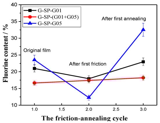 Strikingly, the fluorine content of the hybrid coating film with G-SP-(G01+G05) addition kept very stable during the whole friction-annealing treatment cycle, only exhibiting a very gentle increase of 0.8% (from 17.4 to 18.2%). The results demonstrate that this hybrid film has stable chemical composition at the surface during the friction-annealing treatment process, which is important for the application of low surface energy coatings.
