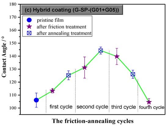 Sustainability of the hydrophobicity is required and crucial for the long-term service life of low surface energy coatings. Based on the above results, the hybrid film with G-SP-(G01+G05) exhibited superior mechanical stability and satisfactory surface hydrophobic performance during the first friction-annealing cycle. Therefore, this film was selected to further run several friction-annealing cycles to explore its capability in retaining the surface hydrophobicity.