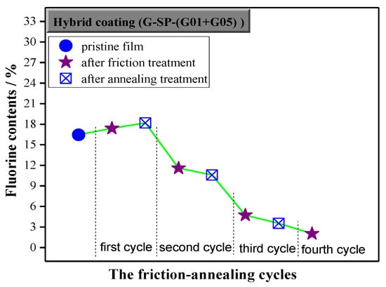 The change in fluorine content on the surface of the hybrid coatings during the first friction-annealing cycle.