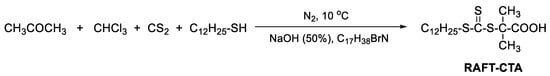RAFT-CTA agent was synthesized according to the literature [21] and the synthesis route is shown in Scheme 1. 1-Dodecanethiol (40.38 g, 0.20 mol), acetone (96.2 g, 1.655 mol), and MTBA (2.69 g, 0.008 mol) were first mixed in a jacketed reactor under nitrogen protection and cooled down to 10 °C. Then, 50% sodium hydroxide solution (16.77 g, 0.21 mol) was added over 20 min. The reaction was stirred for an additional 15 min before carbon disulfide (15.21 g, 0.20 mol) dissolved in acetone (20.18 g, 0.345 mol) was added over 20 min, during which time the color of the solution turned red. After 10 min, chloroform (35.625 g, 0.30 mol) was added in one portion, followed by dropwise addition of 50% sodium hydroxide solution (80 g, 1 mol) over 30 min. The reaction was stirred overnight. Afterwards, 300 mL of water was added, followed by 50 mL of concentrated HCl to acidify the aqueous solution. Nitrogen was purged through the reactor with vigorous stirring to evaporate off acetone. The solid was collected with a Buchner funnel and then stirred in 0.5 L of 2-propanol. After filtering off, the 2-propanol solution was concentrated, and the resulting solid was recrystallized from hexanes to afford 45.5 g of yellow crystalline solid.