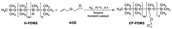 EP-PDMS was synthesized via hydrosilylation reaction between H-PDMS and AGE (Scheme 2). First, AGE (17.1g, 0.15 mol), an equivalent mass of toluene and 300 ppm of Kastedt’s catalyst (with respect to the total mass of reactants) were added into a three-neck round-bottom flask, and the mixture was heated to 65 °C under a nitrogen atmosphere. Then, 50 g H-PDMS was added dropwise to the flask over 30 min while the reaction temperature was increased to 75 °C. The reaction was stirred for 7–8 h and monitored by infrared spectroscopy, in which the disappearance of Si-H peak at 2156 cm−1 was considered as the indication of the completion of the reaction. Finally, excess AGE and toluene were removed via vacuum distillation and 50.3 g (a yield of ~75%) of colorless and transparent product was obtained.