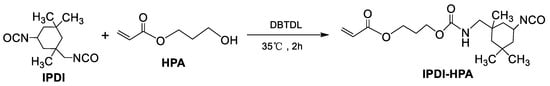 As shown in Scheme 4, IPDI (11.1 g, 0.05 mol) was first mixed with 0.0003 g of DBTDL in a three-neck flask kept at 0–10 °C. Then, HPA (6.5 g, 0.05 mol) was added dropwise into the flask. The temperature was subsequently raised to 35 °C and the reaction mixture was stirred for an additional 2 h to obtain 16.0 g (a yield of ~91%) of colorless and transparent product denoted as IPDI-HPA.