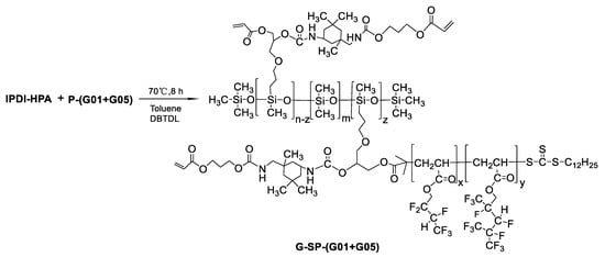 First, 15 g P-(G01+G05), 0.5 wt.% DBTDL and MEHQ, 10 g acetone, and 15 g toluene were added into a three-neck flask which was equipped with a thermometer, a condenser, and a constant pressure funnel. The mixture solution was then heated up to 70 °C. Afterwards, the synthesized IPDI-HPA (dissolved in toluene) was added during the reaction. Isocyanate conversion was monitored by Fourier Transform Infrared (FTIR) spectroscopy, in which the disappearance of NCO-associated peak at 2700 cm−1 indicated the completion of the reaction. The reactants were purified and dried at 30 °C in vacuum for 72 h and the fluoropolymer product denoted G-SP-(G01+G05) was obtained. Scheme 5 shows the synthesis route.