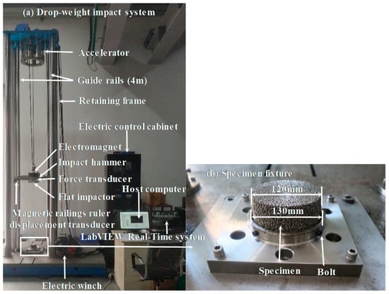 Experimental setup of low-velocity impact tests: (a) drop-weight impact system and (b) specimen fixture.