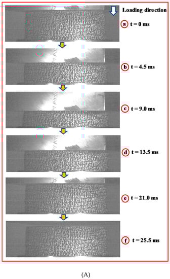 Dynamic compression processes of EMWM (ρr = 0.25, V0 = 3 m/s): (A) Image of the compression processes and (B) Force-displacement of the compression processed.
