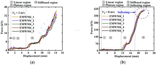 Figure 4 presents two force-displacement curves of an EMWM specimen under different initial impact velocities. It can be seen from Figure 4a that the shape of the curve of the EMWM with a low impact velocity (2 m/s) is similar to that under quasi-static loading, and can be divided into three regions: linear region, plateau region and stiffened region [10]. As shown in Figure 4a, the slope of the force–displacement curve increases with the increase in deformation. However, the shape of the curve of the EMWM with a relatively high impact velocity (8 m/s) can be divided into four regions: linear region, plateau region, stiffened region and softening region. Stiffness softening occurs before maximum deformation is reached (blue dotted circle in Figure 4b). The reason for the difference in the shape of the curves is that the air damping is not obvious at a relatively low impact velocity. In the case of a relative-high velocity impact loading, the impact energy is dissipated by the EMWM in the form of plastic deformation, dry friction and air damping, and the deformation velocity of the EMWM will become slower until it reaches maximum deformation. This means that air damping will gradually decrease until it is zero.