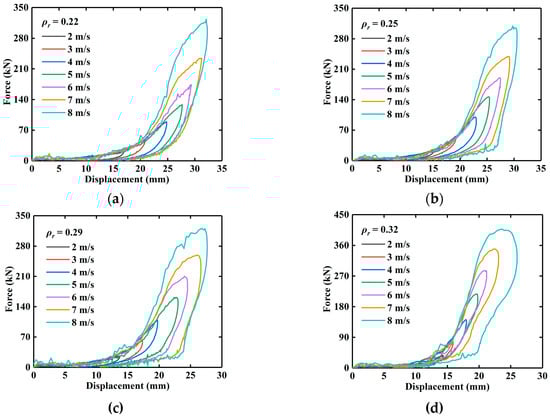 Experimental force-displacement curves of the EMWM with different relative densities under different impact velocities: (a) ρr = 0.22, (b) ρr =0.25, (c) ρr = 0.29, and (d) ρr = 0.32.